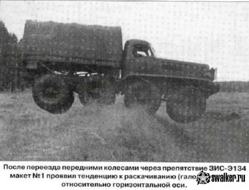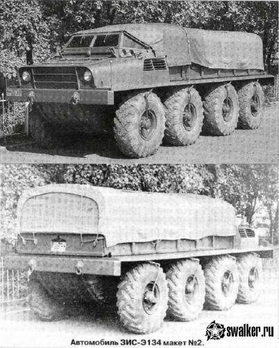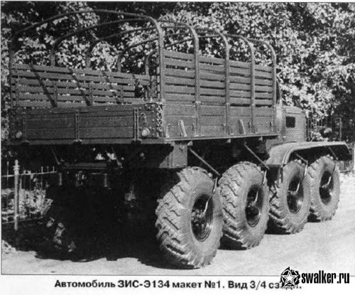 Поскольку опыта разработки таких машин не было, то для изучения вопросов повышения проходимости колесных автомобилей, а также для оценки влияния отдельных конструктивных параметров на проходимость в течение июля-августа 1955 г. был построен опытный четырехосный (8×8) грузовой автомобиль ЗИС-Э134 макет №1.