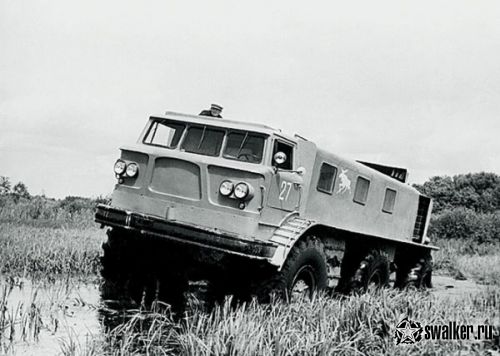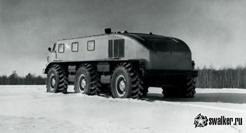 В движение супервездеход приводился двумя двигателями ЗИЛ-375 по 118 л.с. каждый, мощность передавалась по бортовой схеме. Размещались двигатели сзади, для лучшего охлаждения были предусмотрены воздухозаборники по бокам кузова. Огромные колеса, обутые в шины размерностью 21.00-28 и диаметром 1790мм на уникальных стеклопластиковых (!) сборных дисках с металлическими элементами, весили почти в три раза меньше металлических аналогов. Дорожный просвет машины с этими колесами составлял 852 мм, днище было закрыто стальными листами для защиты агрегатов и лучшего скольжения по снегу и грязи.