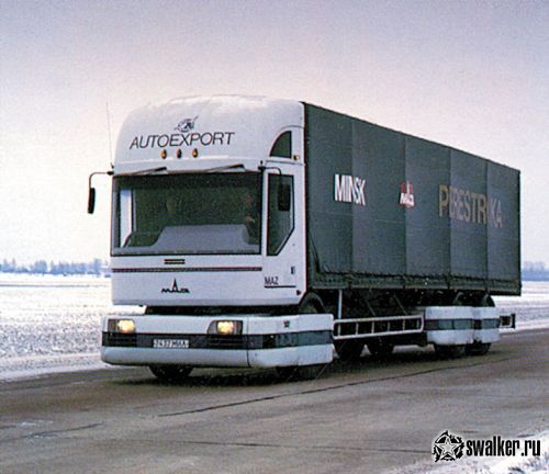 МАЗ 2000 «Перестройка» (1988) – прототип магистрального грузовика, отличавшийся оригинальной модульной конструкцией: спереди располагалась большая часть агрегатов – двигатель, коробка передач, ведущий мост и рулевое управление. При необходимости любая из «пассивных» тележек заменялась подобным набором агрегатов, позволяя строить автопоезда любой длины и грузоподъемности.