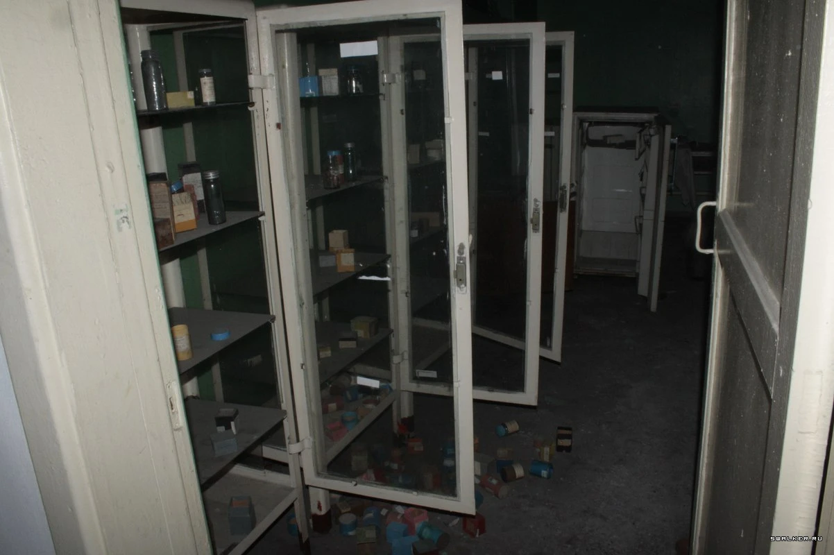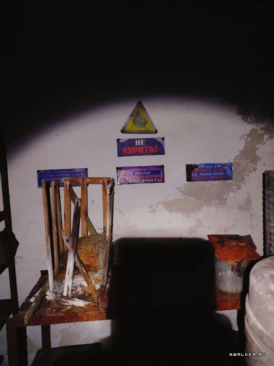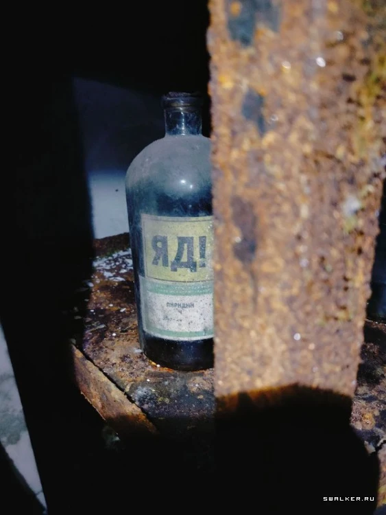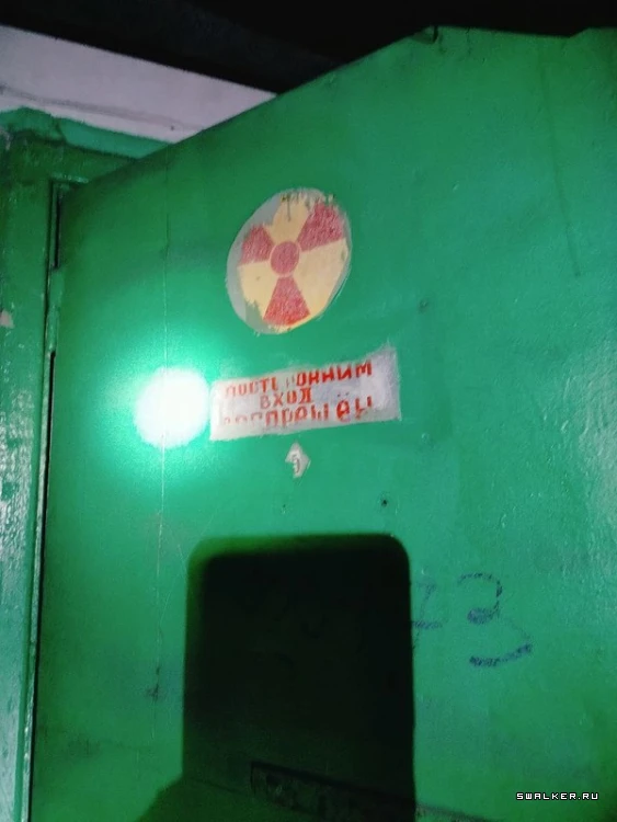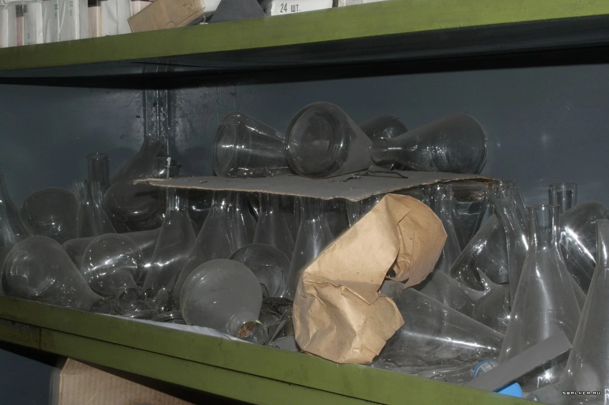 Войдя в здание, я оказался в большом тёмном коридоре первого этажа. Первое, что бросилось в глаза, — дверь с радиационным знаком, который всем своим видом показывал что в помещении опасно, и ходить туда не стоит. Однако насчёт этого у меня было другое мнение. Я без раздумий открыл её. Внутри стояли стеллажи с химическими реагентами. ![]()
