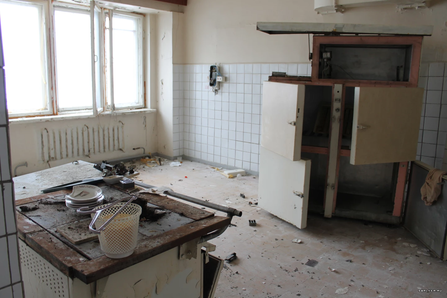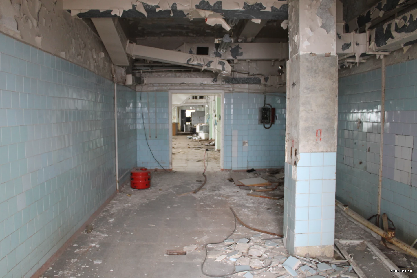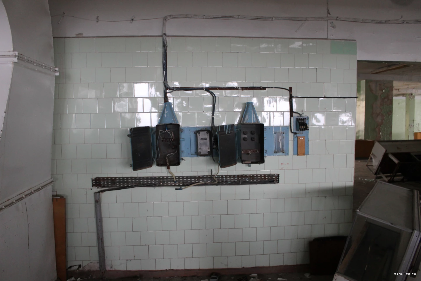 Из технических помещений попадаем на лестничную площадку для персонала столовой и далее перемещаемся на этаж выше