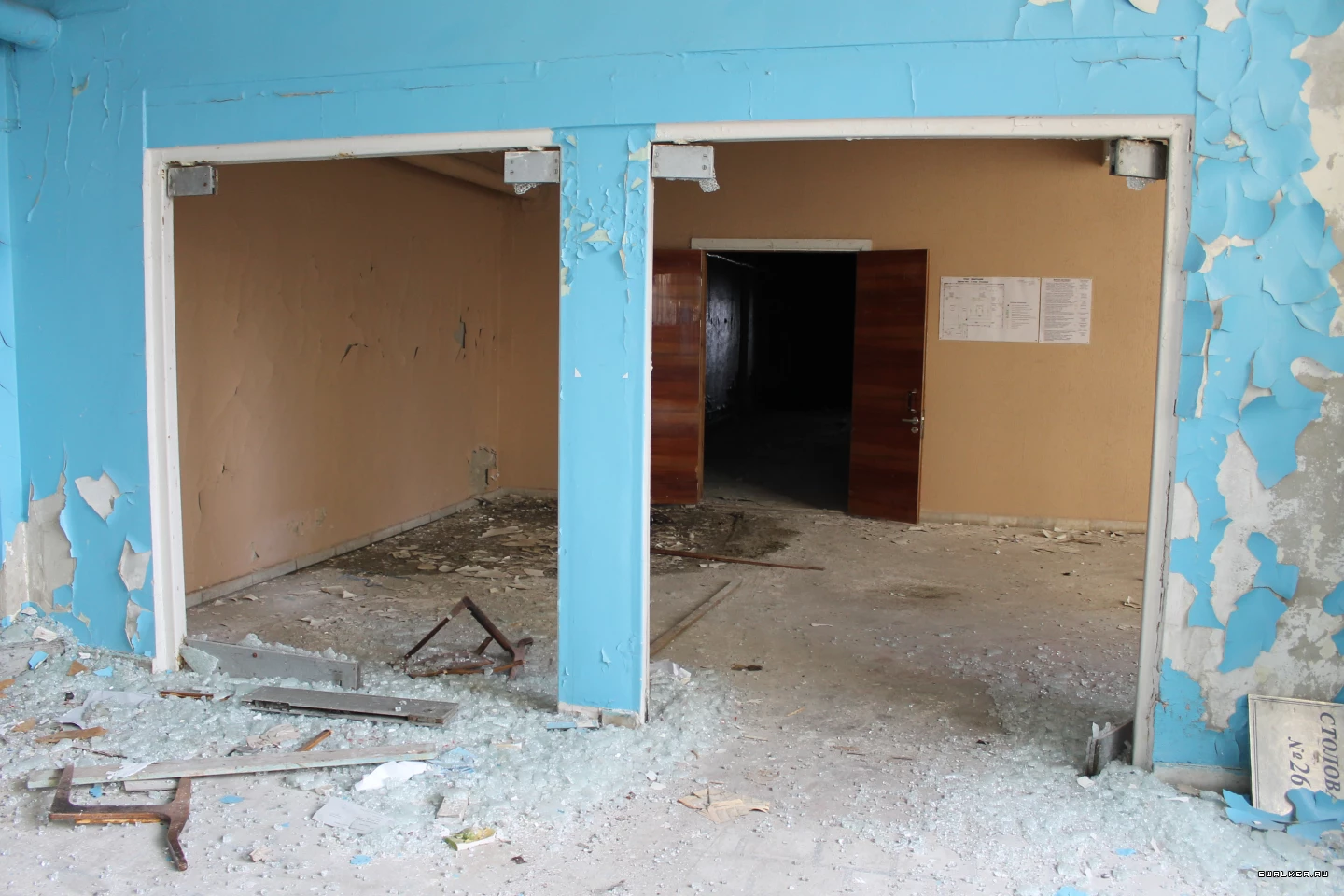 Стеклянные двери изначально были закрыты на замки, после с ними не церемонились и просто расколотили